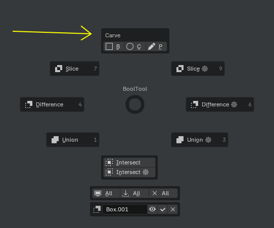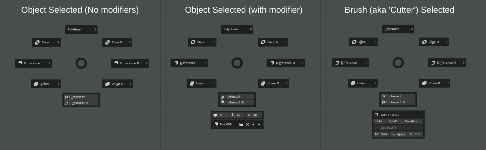 Functions like the Modo versions, but with Active Element & cursor options instead of Workplane.