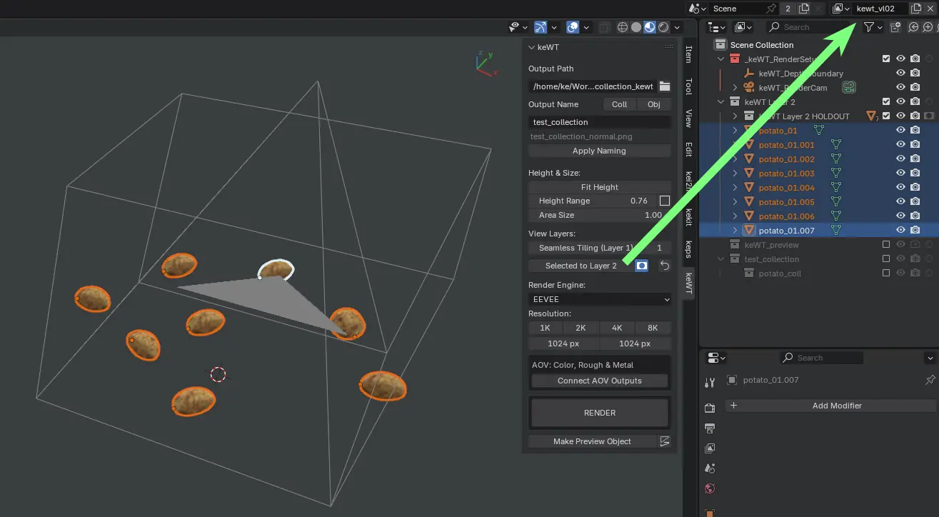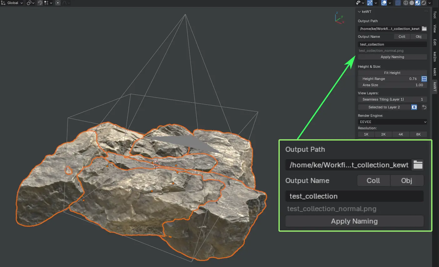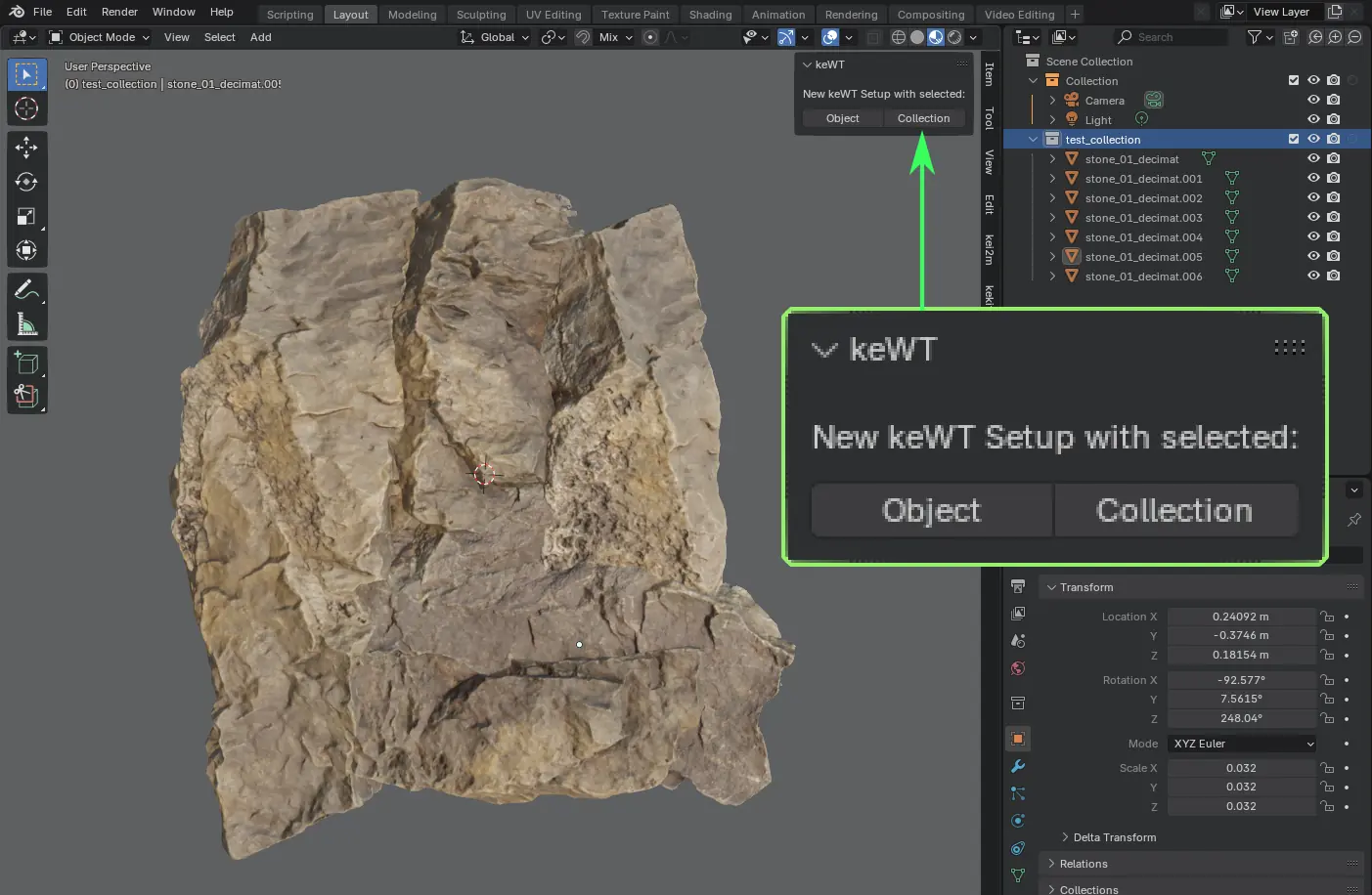 - keWT will automatically create a new blend file with a selected object or collection using the Default Setup file