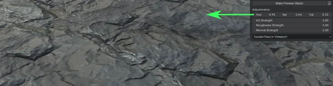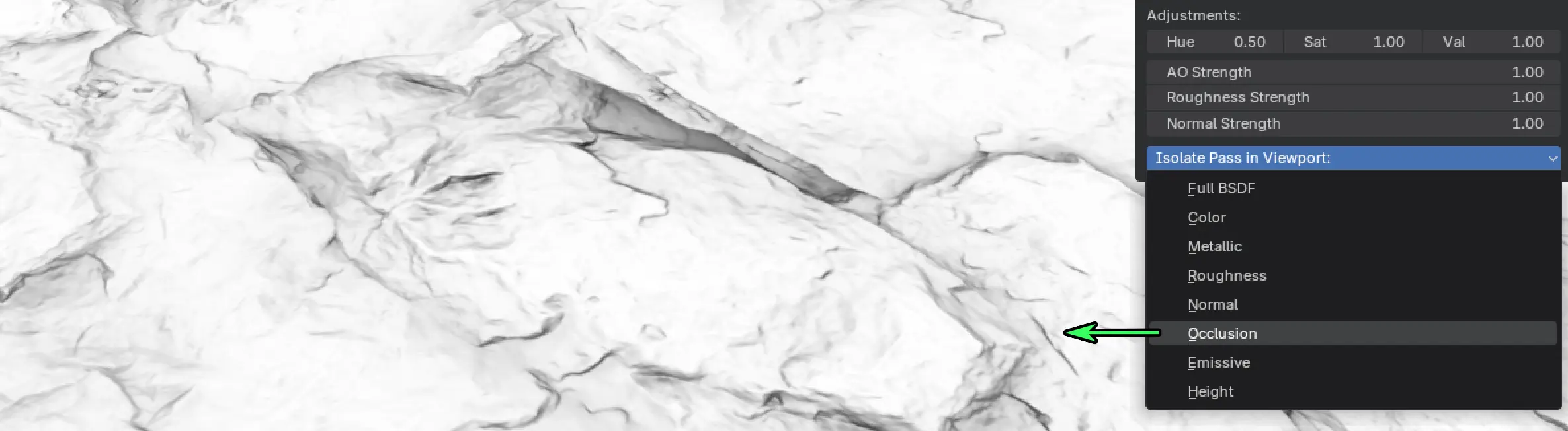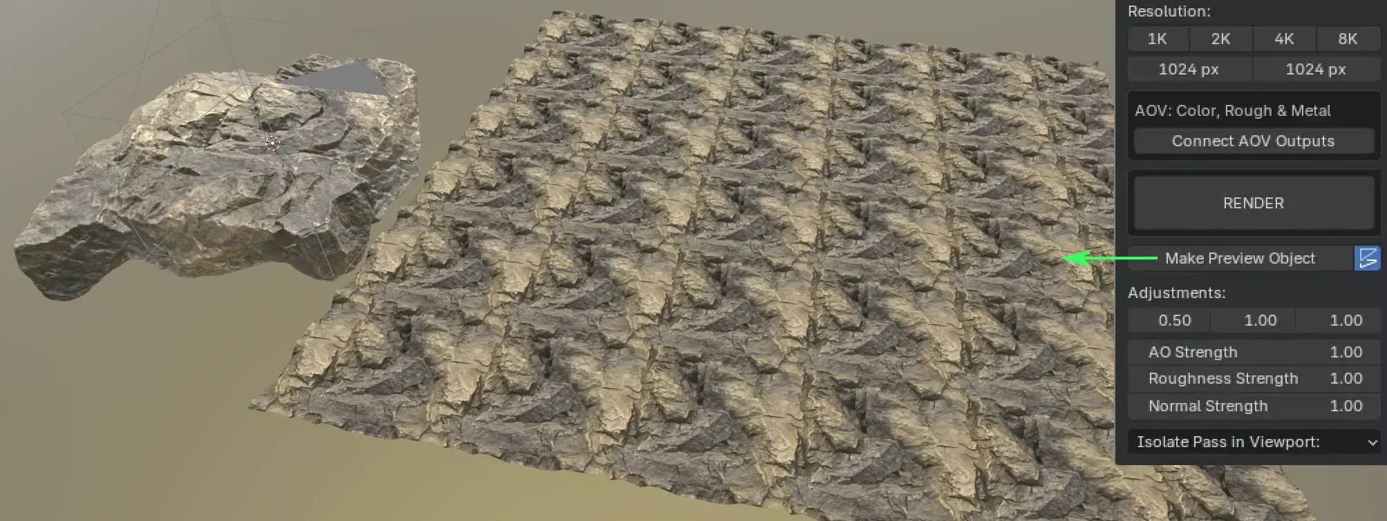 Isolate pass shows the preview object's preview material's render outputs as unlit shading in the viewport: