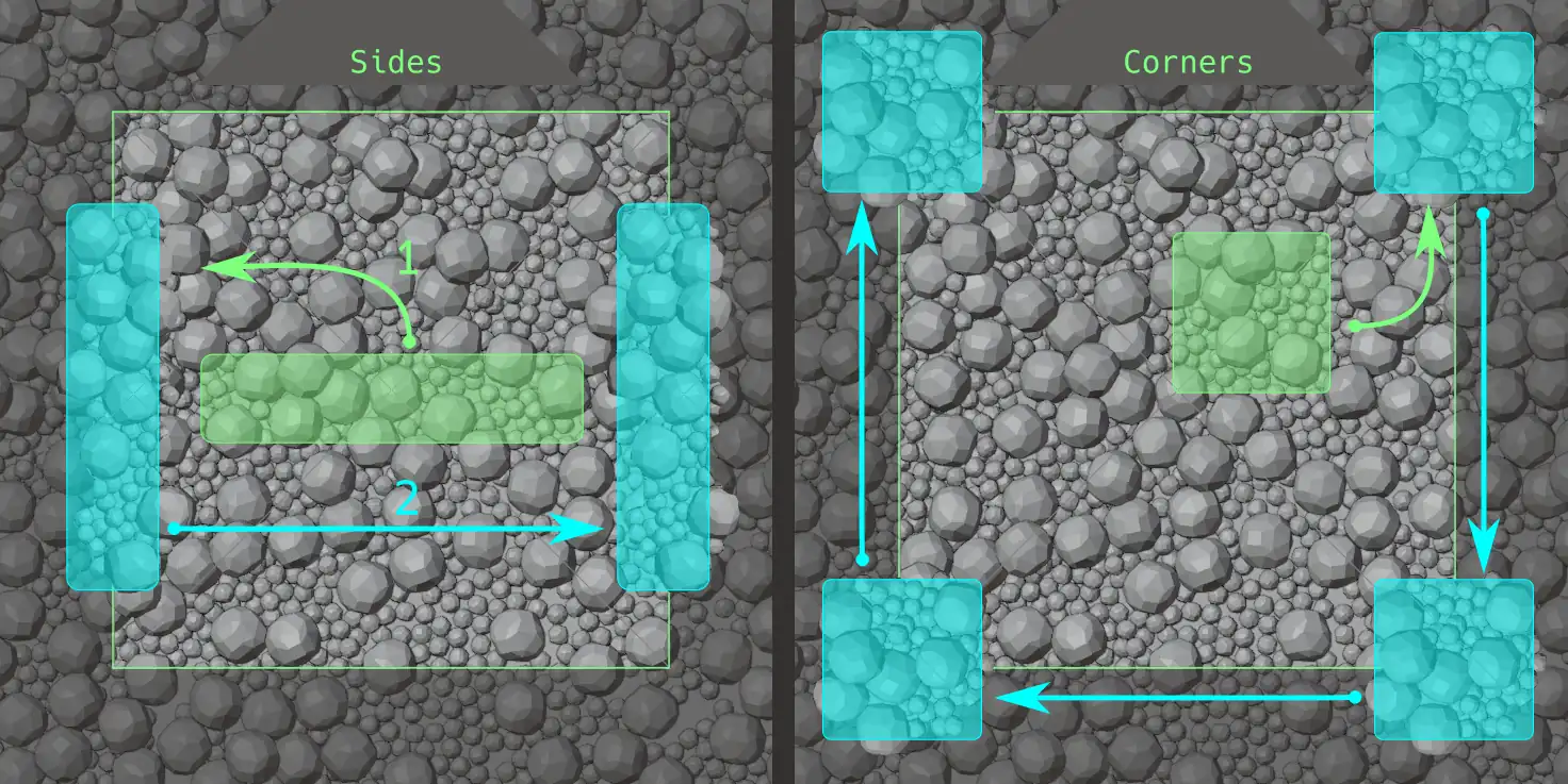 Collection, duplicate & rotate the selection 90 degrees (to reduce repetition) and place at the sides, left to right (2). And then similarly top to bottom. (Not illustrated; same principle.)