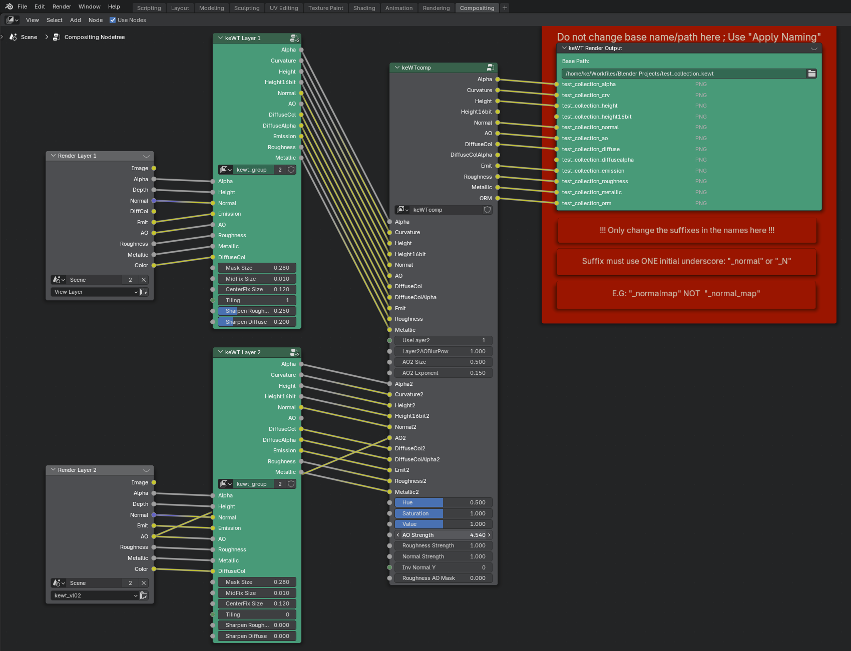 - Change suffixes in the keWT Render Outputs node. Changing “_normal” to “_n” etc.