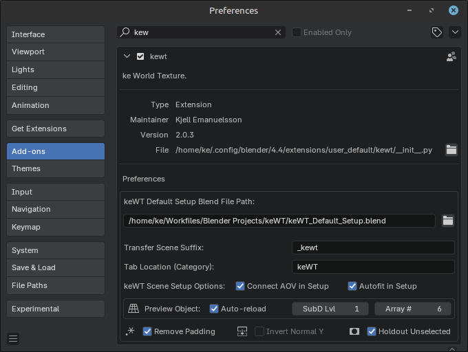 Strongly Recommended: Move the keWT Default file from the Blender user directory to somewhere (safe) to avoid having to update the path (or overwriting a customized one!) when updating Blender or keWT.