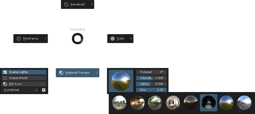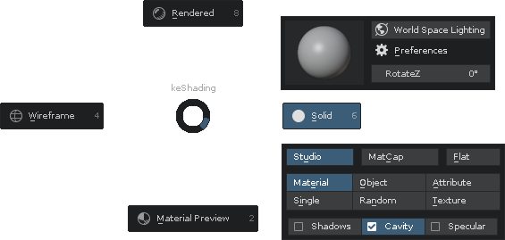 Viewport shading pie menu -for quick access to scene & object shading options.
