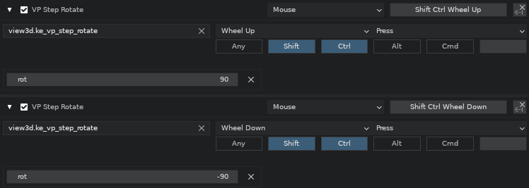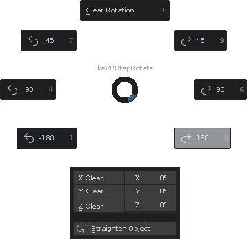 Preset step rotations for selected object(s) - using Step Rotate45, 90 and Op.Rot degrees (either way), axis plane based on the view.