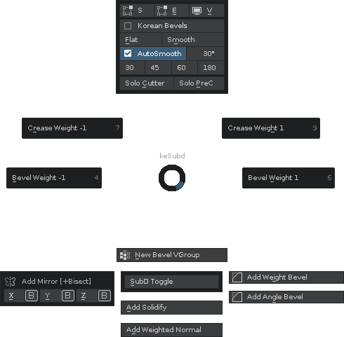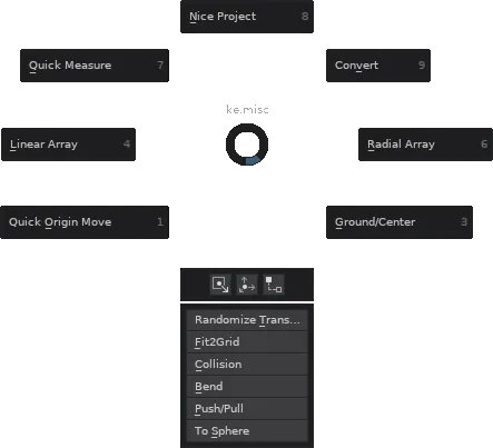The keKit Custom Pie Menus either expands (and replaces) the default Blender counterparts, are or keKit specific.(old) VIDEO (YT)